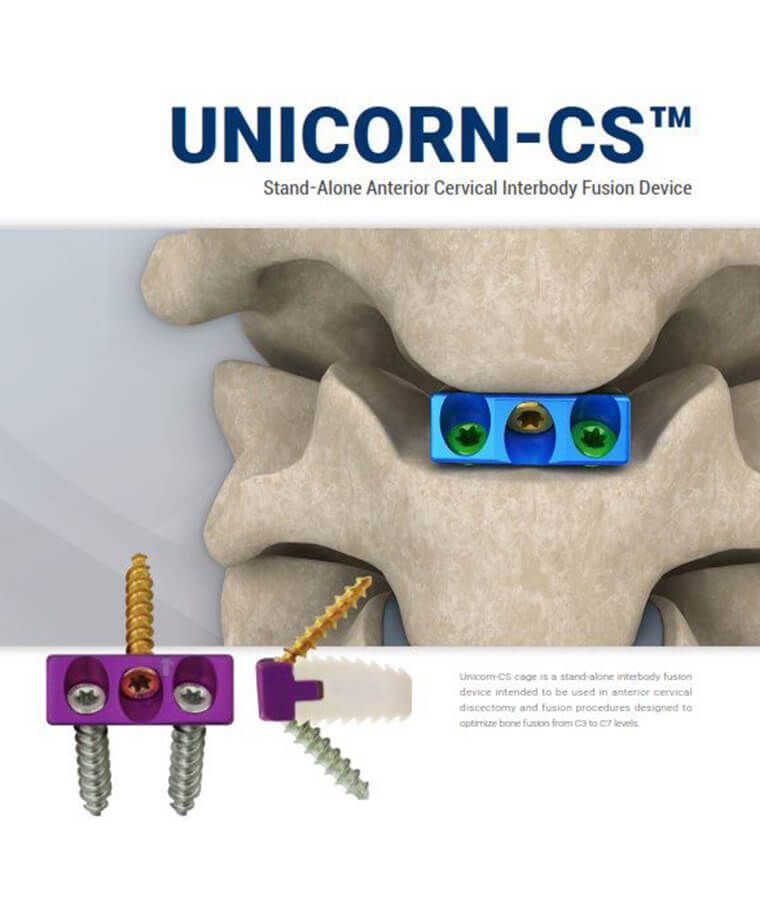 La jaula Unicorn-CS es un dispositivo de fusión interbody autónomo destinado a ser utilizado en procedimientos de discectomía y fusión cervical anterior diseñado para optimizar la fusión ósea desde los niveles C3 a C7. El diseño combina la funcionalidad de un espaciador cervical de PEEK y las ventajas de la placa cervical anterior de aleación de titanio, minimizando el riesgo de osificación del nivel adyacente.